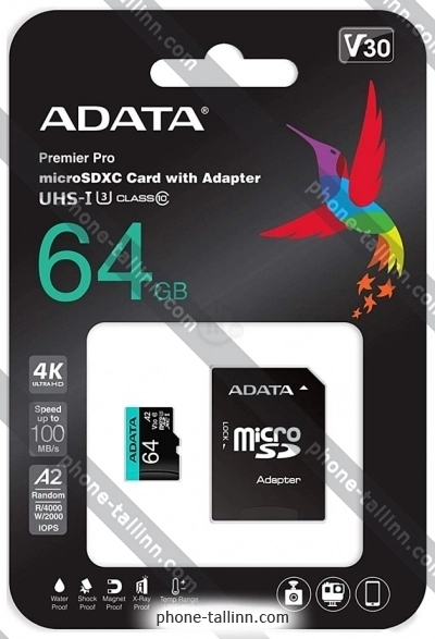 ADATA Premier Pro AUSDX64GUI3V30SA2-RA1 microSDXC 64GB (с адаптером) - купить в Таллине, Эстония.